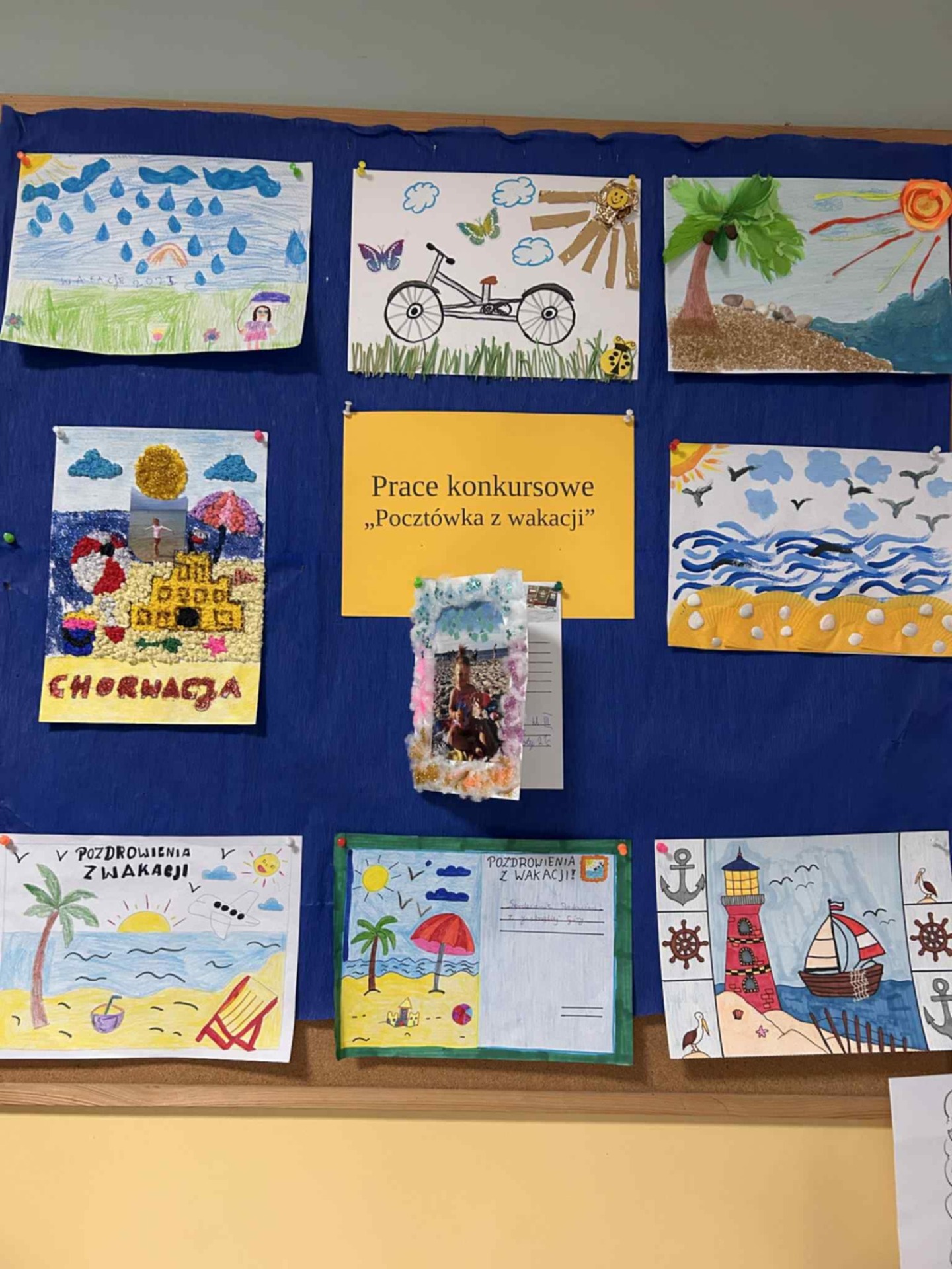 W naszej szkole odbył się konkurs plastyczny „Pocztówka z wakacji”, w którym udział wzięli uczniowie klas I–VIII. Prace oceniane były w dwóch kategoriach wiekowych: klasy I–III oraz klasy IV–VIII. Laureaci otrzymali nagrody rzeczowe, a wszyscy uczestnicy zostali wyróżnieni upominkami za udział w konkursie. Nagrody zostały ufundowane przez Radę Rodziców oraz Caritas, za co serdecznie dziękujemy. Konkurs był okazją do rozwijania talentów plastycznych i twórczego wspominania wakacyjnych chwil.Organizatorami konkursu były p. Sylwia Karpińska i p. Maria Nowicka.
